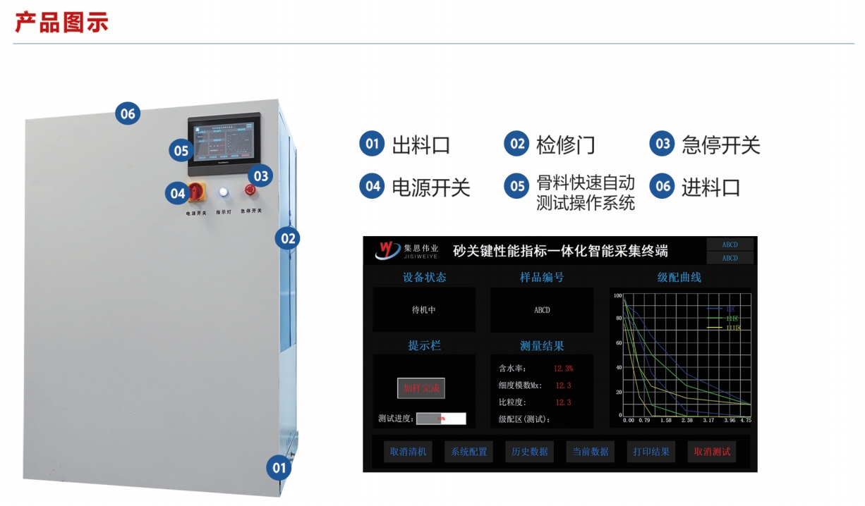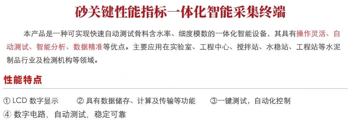 砂關(guān)鍵性能指標(biāo)一體化智能采集終端實現(xiàn)快速自動測試骨料含水率,細(xì)度模數(shù)的一體化智能設(shè)備,其具有操作靈活,自動測試,智能分析,數(shù)據(jù)精準(zhǔn)等特點